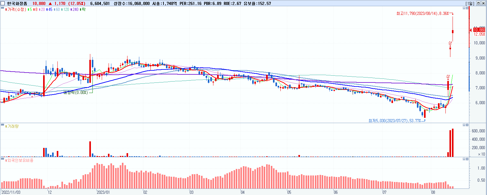 - 한국화장품 (10,880원 ▲ 12.05% , 시총: 1,748억, 거래량: 6,609,358, 거래대금:735억, KOSPI)