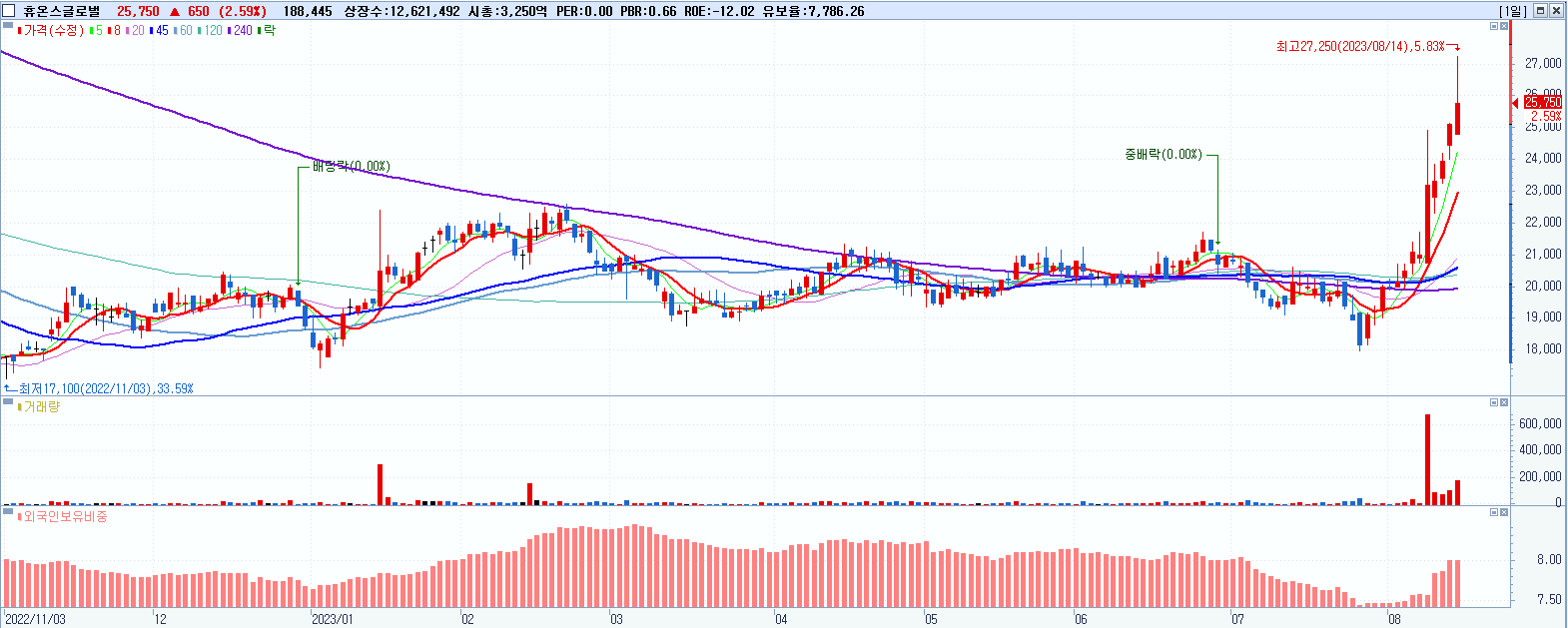 - 휴온스글로벌 (25,750원 ▲ 2.59% , 시총: 3,250억, 거래량: 188,445, 거래대금:49억, KOSDAQ)