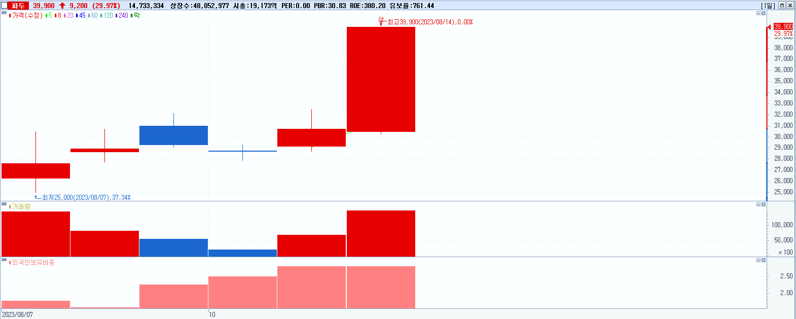 파두 39,900원 ▲ 29.97% (KOSDAQ, 440110)