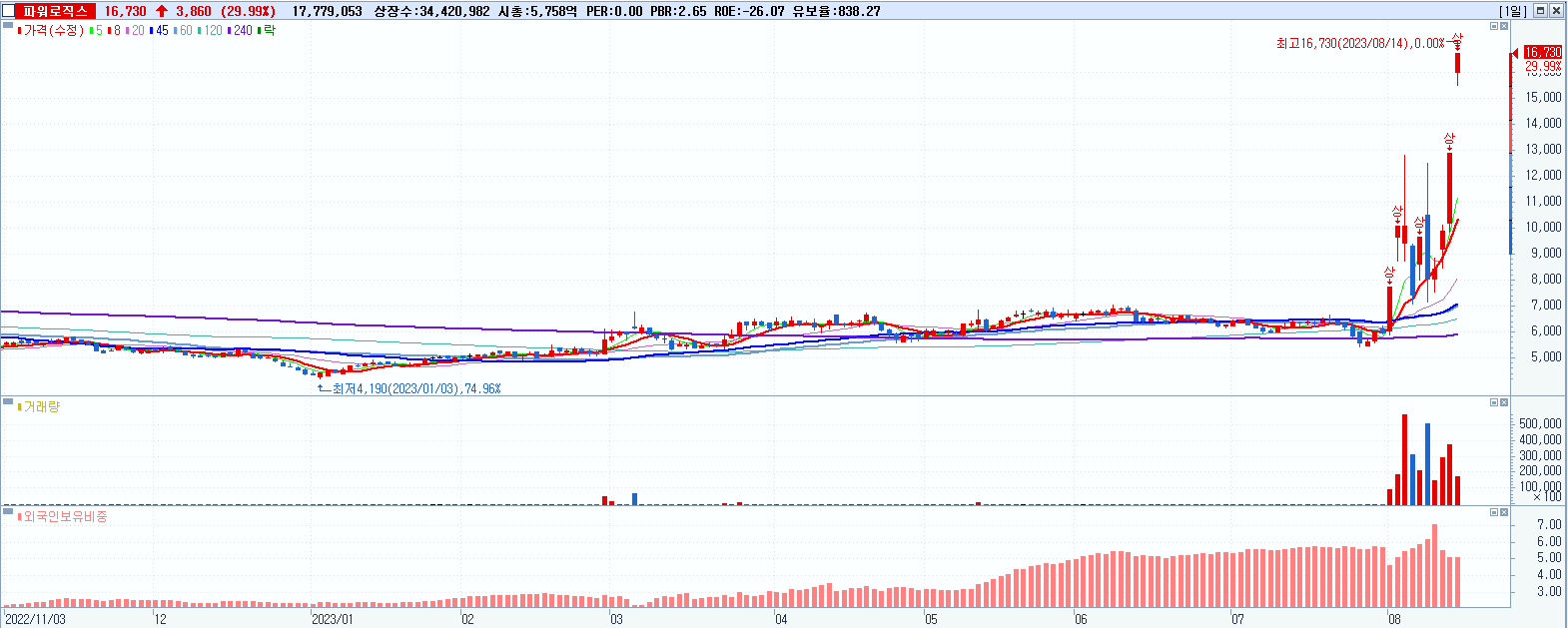 - 파워로직스 (16,730원 ▲ 29.99% , 시총: 5,759억, 거래량: 17,848,315, 거래대금:2,878억, KOSDAQ)
