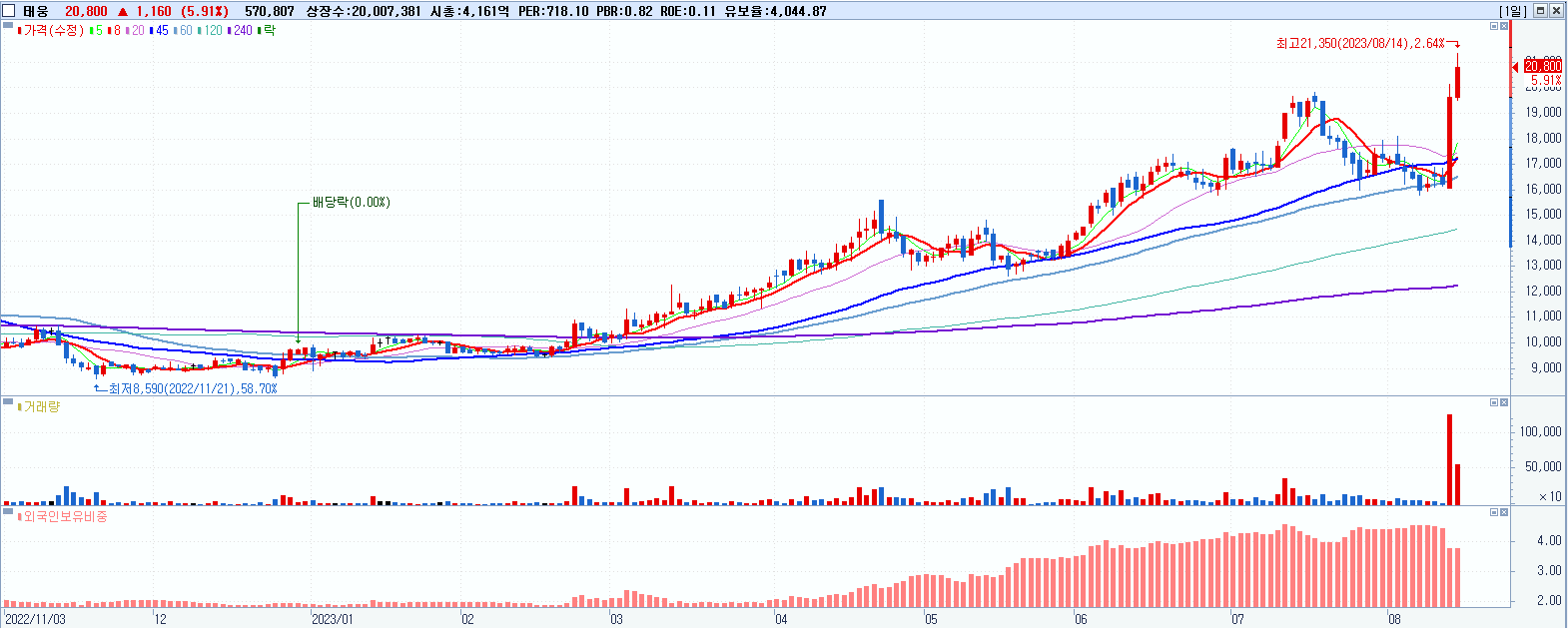- 태웅 (20,800원 ▲ 5.91% , 시총: 4,162억, 거래량: 571,132, 거래대금:118억, KOSDAQ)