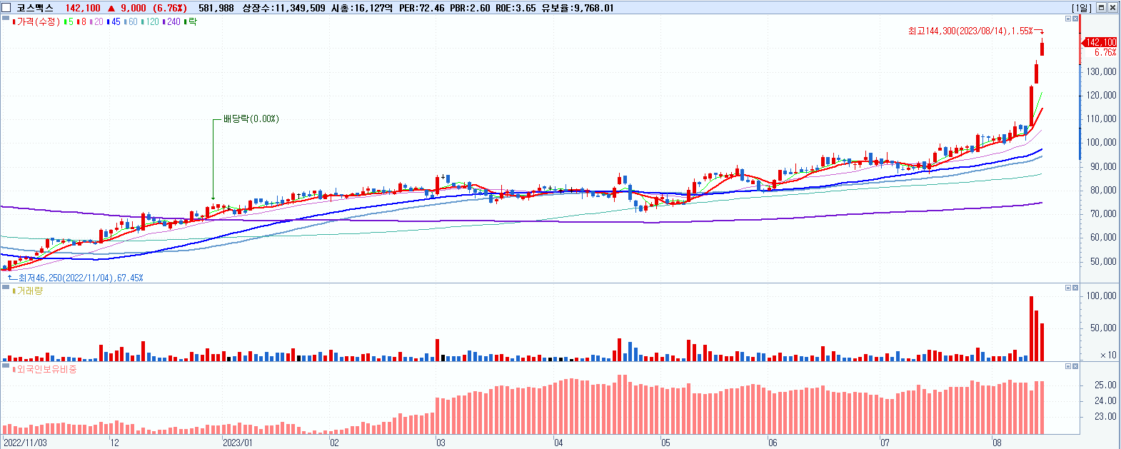 - 코스맥스 (142,100원 ▲ 6.76% , 시총: 16,128억, 거래량: 582,076, 거래대금:822억, KOSPI)