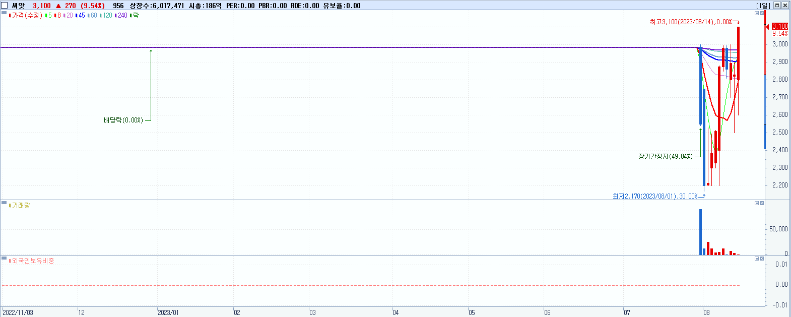 - 씨앗 (3,100원 ▲ 9.54% , 시총: 187억, 거래량: 956, 거래대금:0억, KOSDAQ)