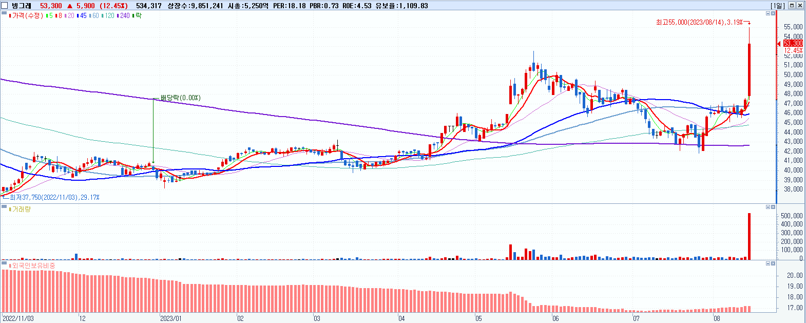 - 빙그레 (53,300원 ▲ 12.45% , 시총: 5,251억, 거래량: 534,897, 거래대금:281억, KOSPI)