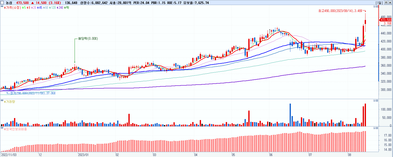 - 농심 (473,500원 ▲ 3.16% , 시총: 28,801억, 거래량: 136,702, 거래대금:635억, KOSPI)