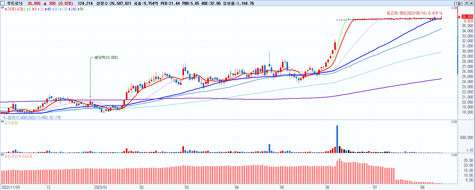 루트로닉 36,800원 ▲ 0.82% (KOSDAQ, 085370)
