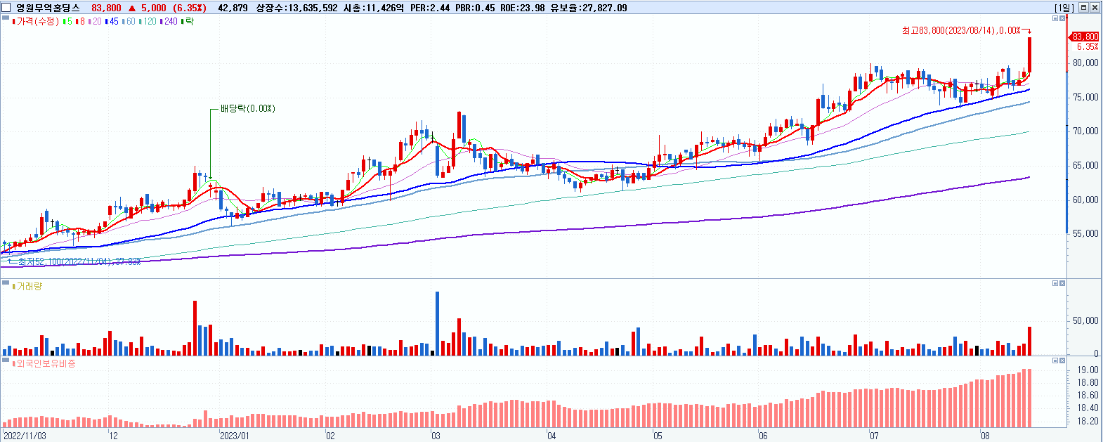 - 영원무역홀딩스 (83,800원 ▲ 6.35% , 시총: 11,427억, 거래량: 42,934, 거래대금:35억, KOSPI)