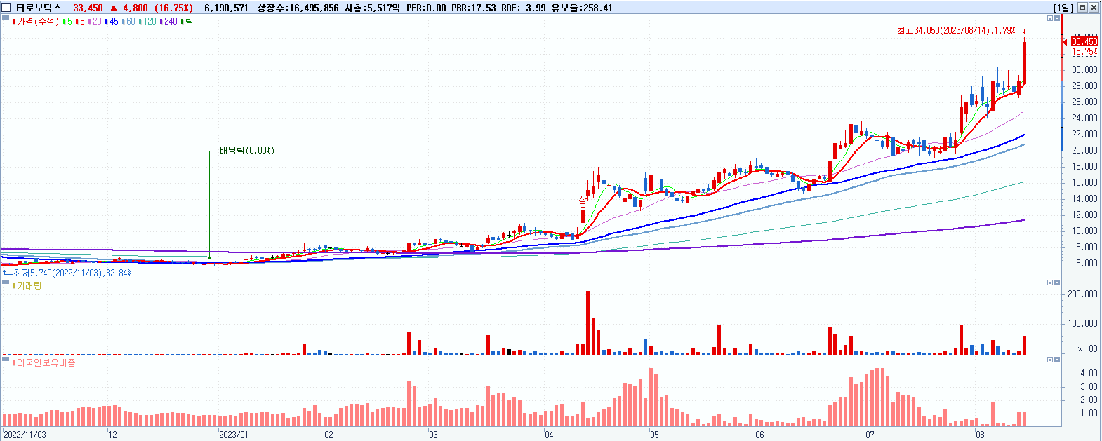 - 티로보틱스 (33,450원 ▲ 16.75% , 시총: 5,518억, 거래량: 6,202,910, 거래대금:1,999억, KOSDAQ)