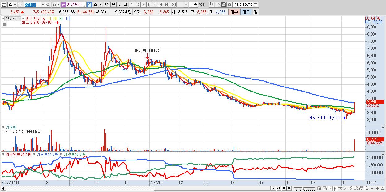 - 젠큐릭스 (3,250원 ▲ 29.22% , 시총: 469억, 거래량: 6,256,722, 거래대금:194억)