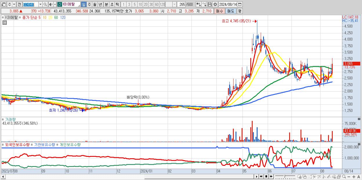 - KBI메탈 (3,065원 ▲ 13.73% , 시총: 1,070억, 거래량: 43,413,355, 거래대금:1,352억)