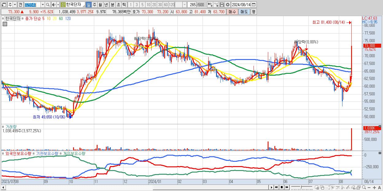 - 한국단자 (73,300원 ▲ 15.62% , 시총: 7,634억, 거래량: 1,038,499, 거래대금:784억)
