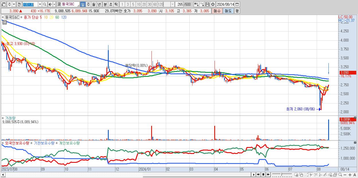 - 동국S&C (3,090원 ▲ 16.17% , 시총: 1,766억, 거래량: 9,088,505, 거래대금:291억)