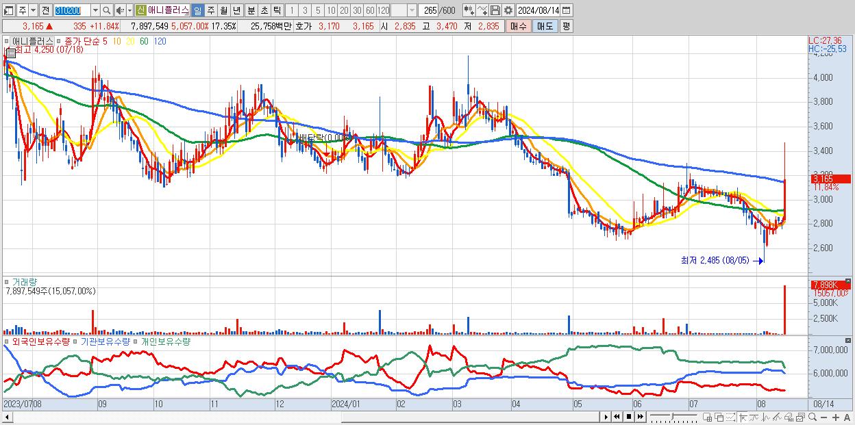 - 애니플러스 (3,165원 ▲ 11.84% , 시총: 1,441억, 거래량: 7,897,549, 거래대금:258억)