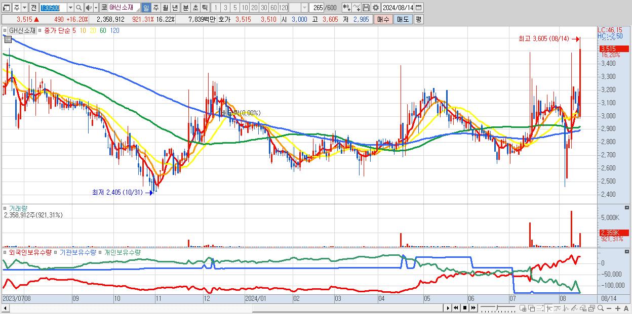- GH신소재 (3,515원 ▲ 16.2% , 시총: 511억, 거래량: 2,358,912, 거래대금:78억)