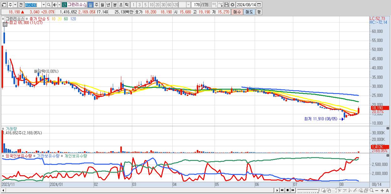 - 그린리소스 (18,190원 ▲ 20.07% , 시총: 1,504억, 거래량: 1,416,652, 거래대금:251억)