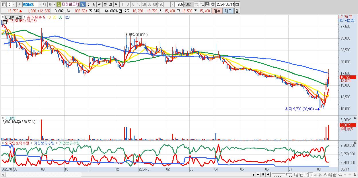 - 미래반도체 (16,720원 ▲ 12.82% , 시총: 2,414억, 거래량: 3,687,164, 거래대금:647억)