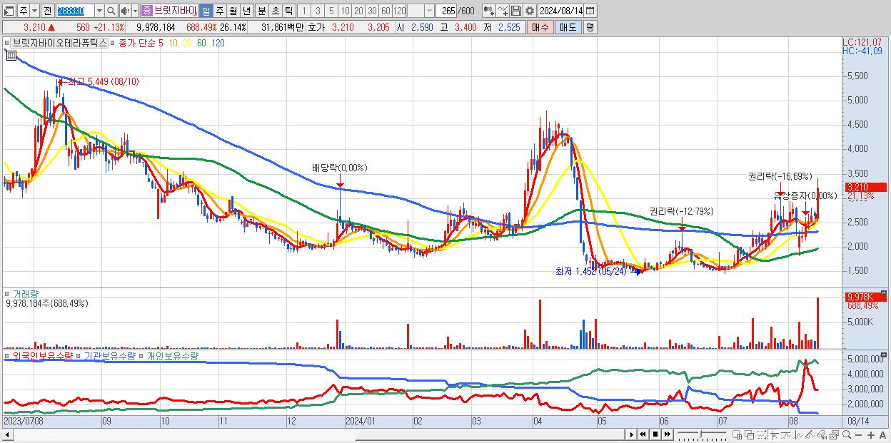 - 브릿지바이오테라퓨틱스 (3,210원 ▲ 21.13% , 시총: 1,225억, 거래량: 9,978,184, 거래대금:319억)