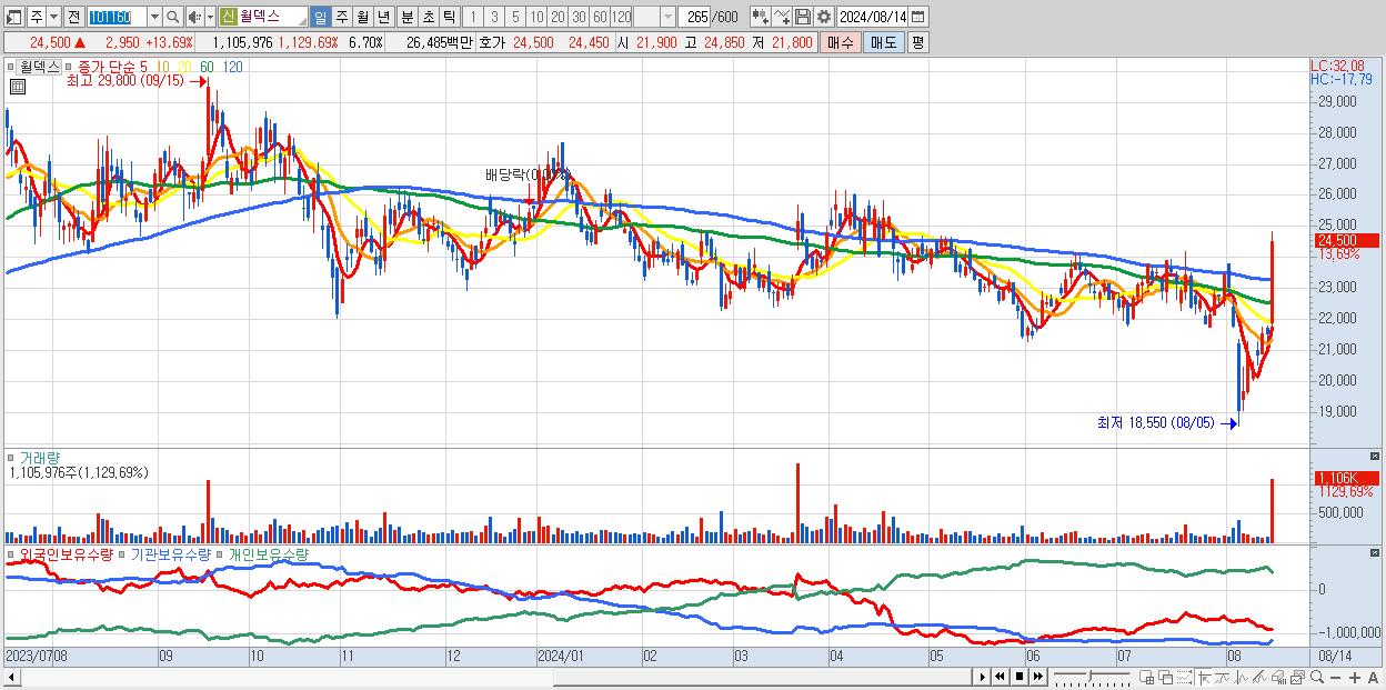 - 월덱스 (24,500원 ▲ 13.69% , 시총: 4,045억, 거래량: 1,105,976, 거래대금:265억)