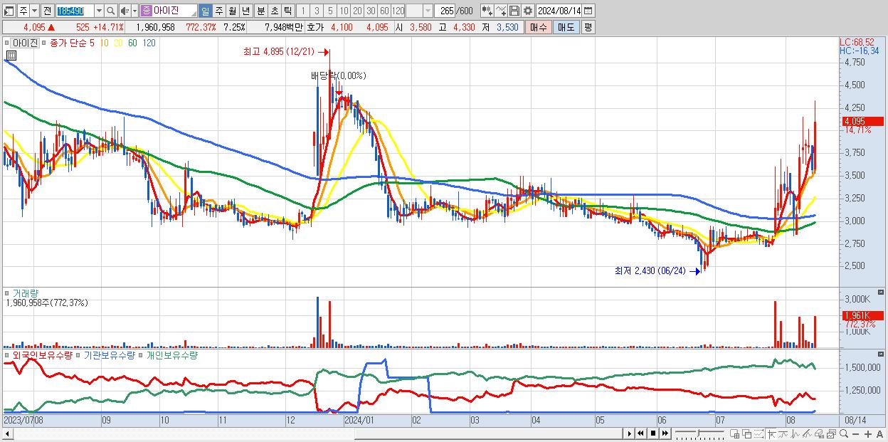 - 아이진 (4,095원 ▲ 14.71% , 시총: 1,107억, 거래량: 1,960,958, 거래대금:79억)