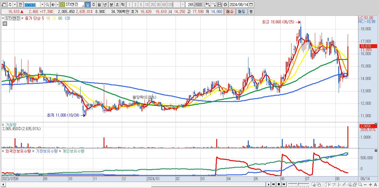 - STX엔진 (16,610원 ▲ 17.39% , 시총: 3,822억, 거래량: 2,065,450, 거래대금:348억)