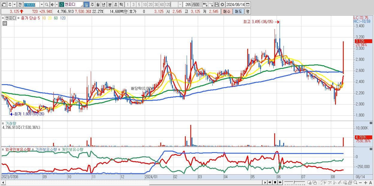 - 엔피디 (3,125원 ▲ 29.94% , 시총: 673억, 거래량: 4,796,913, 거래대금:147억)