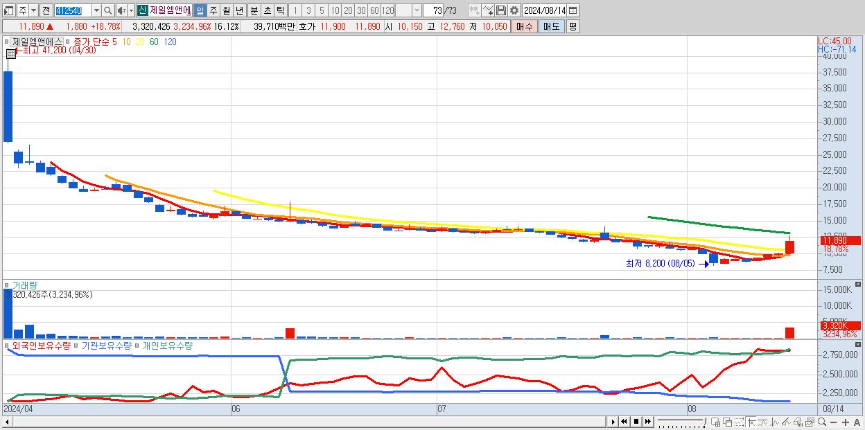 - 제일엠앤에스 (11,890원 ▲ 18.78% , 시총: 2,449억, 거래량: 3,320,426, 거래대금:397억)
