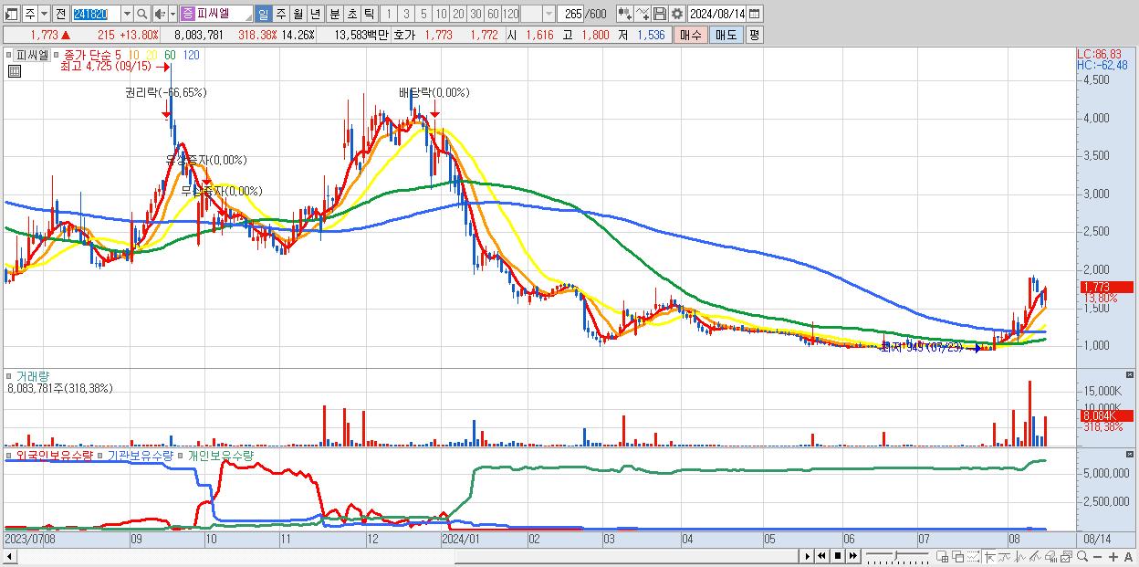 - 피씨엘 (1,773원 ▲ 13.8% , 시총: 1,005억, 거래량: 8,083,781, 거래대금:136억)