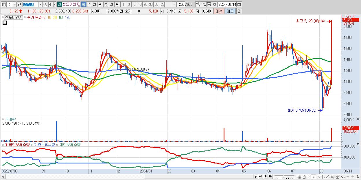 - 성도이엔지 (5,120원 ▲ 29.95% , 시총: 792억, 거래량: 2,506,498, 거래대금:120억)