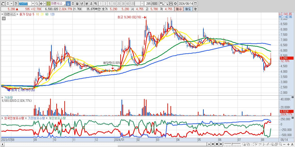- 이랜시스 (5,280원 ▲ 12.7% , 시총: 1,600억, 거래량: 6,593,020, 거래대금:357억)