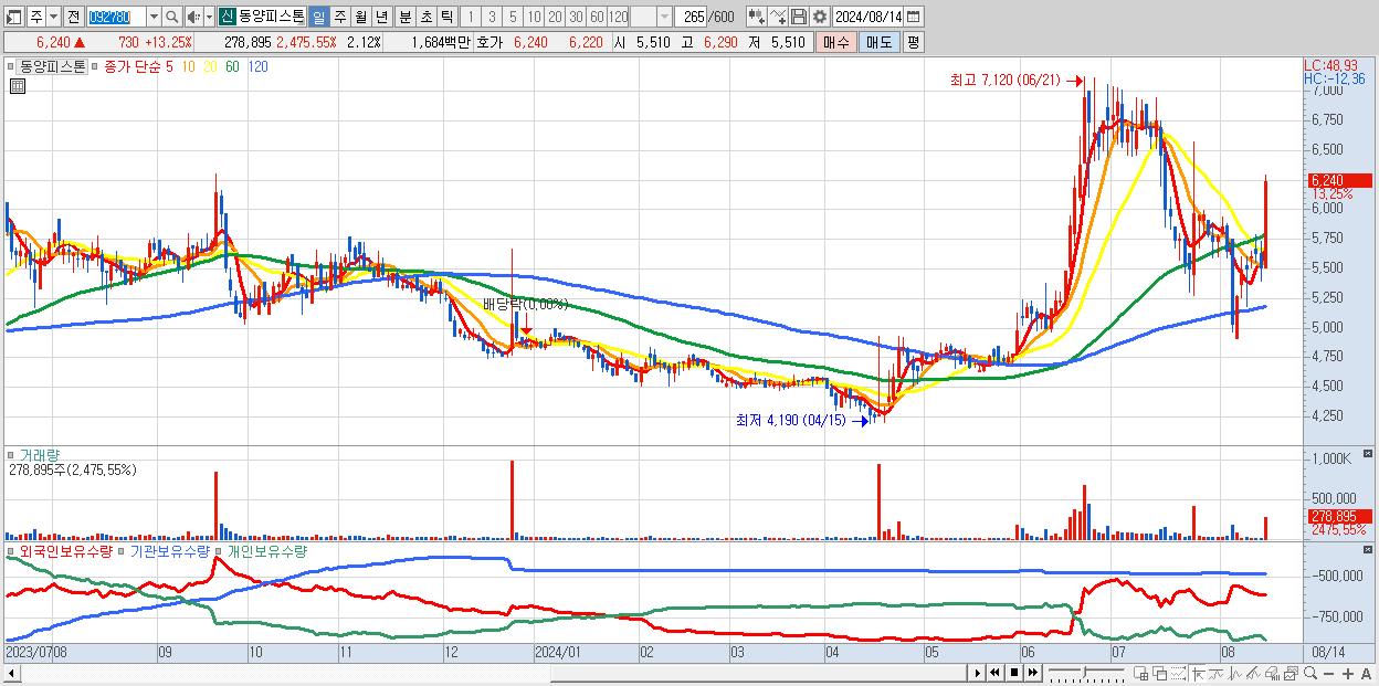 - 동양피스톤 (6,240원 ▲ 13.25% , 시총: 822억, 거래량: 278,895, 거래대금:17억)
