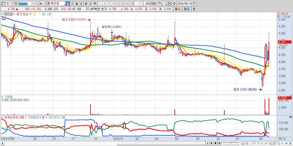 - 케이엠 (4,705원 ▲ 16.32% , 시총: 582억, 거래량: 5,835,123, 거래대금:274억)