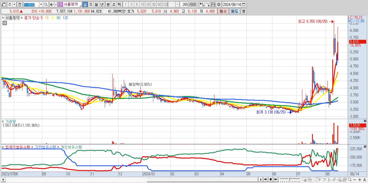 - 서울제약 (5,610원 ▲ 16.88% , 시총: 654억, 거래량: 7,557,104, 거래대금:420억)