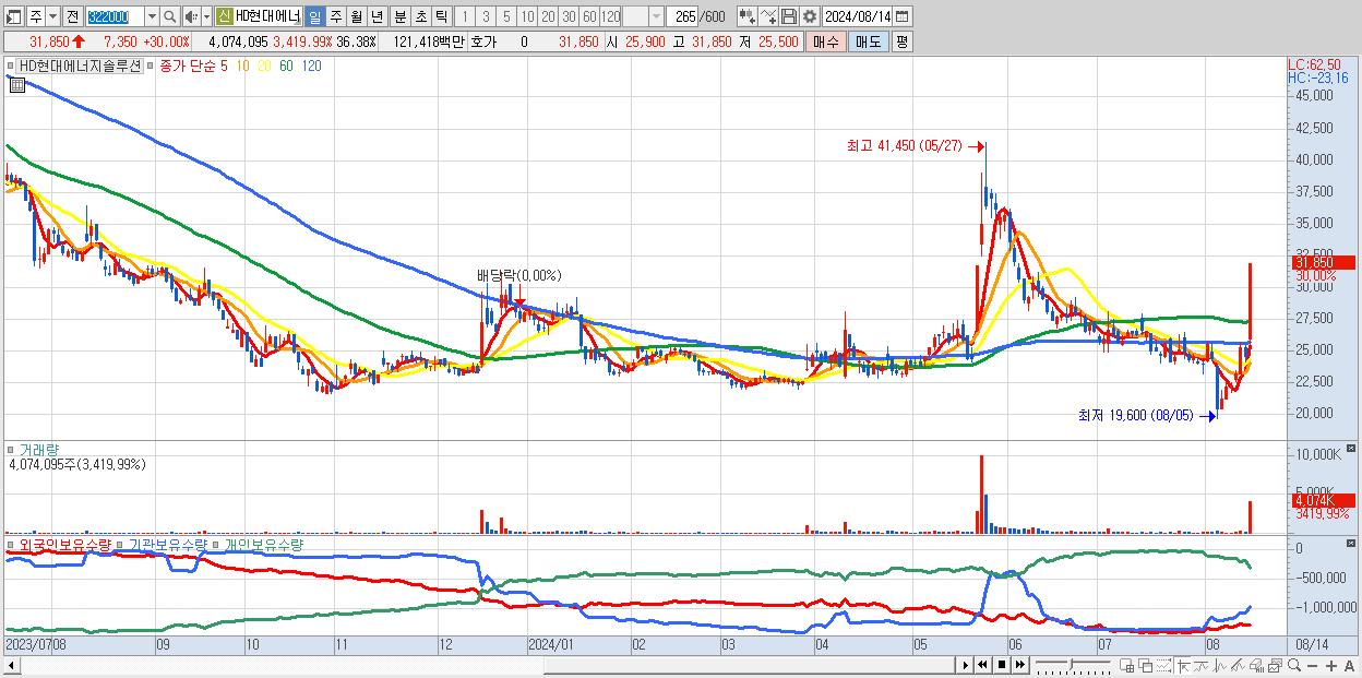 - HD현대에너지솔루션 (31,850원 ▲ 30% , 시총: 3,567억, 거래량: 4,074,095, 거래대금:1,214억)