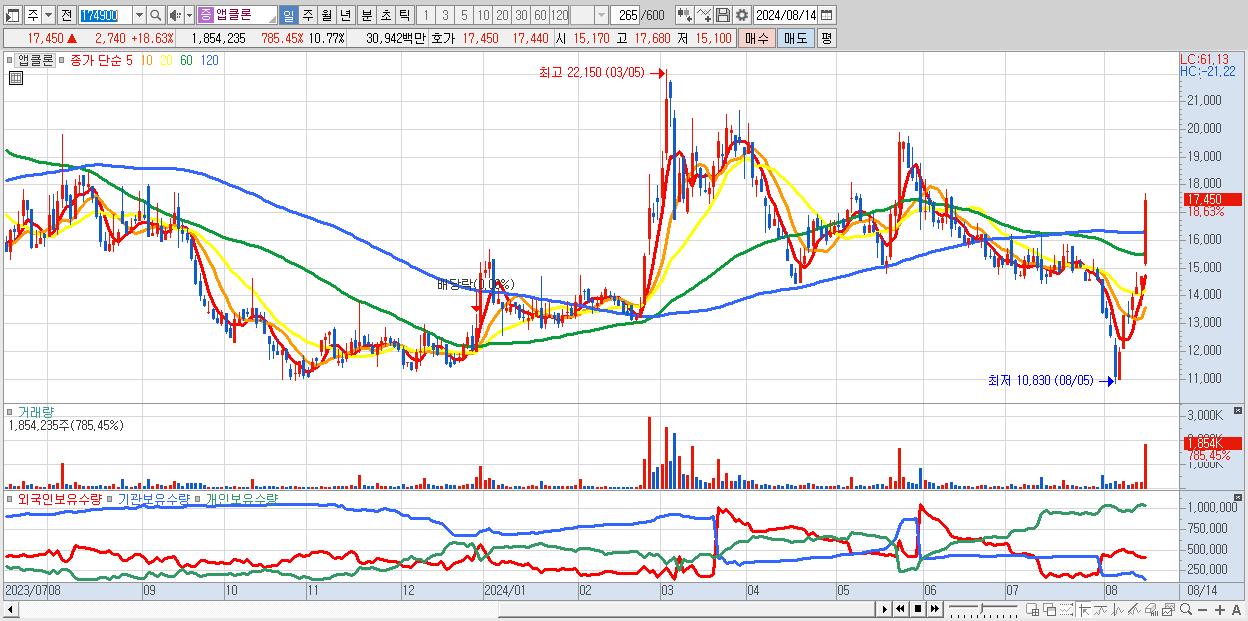 - 앱클론 (17,450원 ▲ 18.63% , 시총: 3,005억, 거래량: 1,854,235, 거래대금:309억)