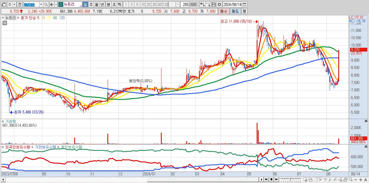 - 뉴트리 (9,720원 ▲ 29.95% , 시총: 894억, 거래량: 661,386, 거래대금:62억)