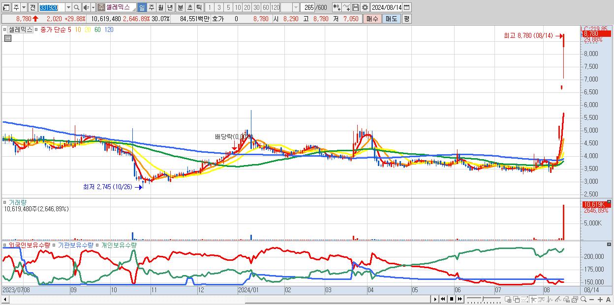 - 셀레믹스 (8,780원 ▲ 29.88% , 시총: 717억, 거래량: 10,619,480, 거래대금:846억)