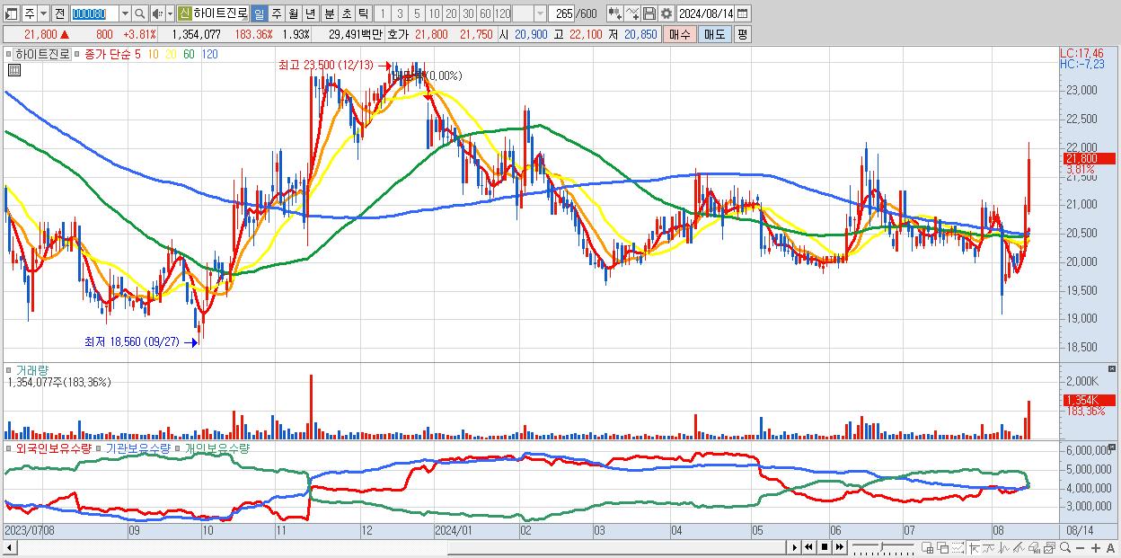 - 하이트진로 (21,800원 ▲ 3.81% , 시총: 15,289억, 외국인 순매수 거래금:115억)