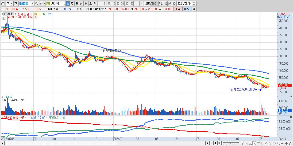 - LG화학 (296,000원 ▲ 2.6% , 시총: 208,953억, 외국인 순매수 거래금:59억)