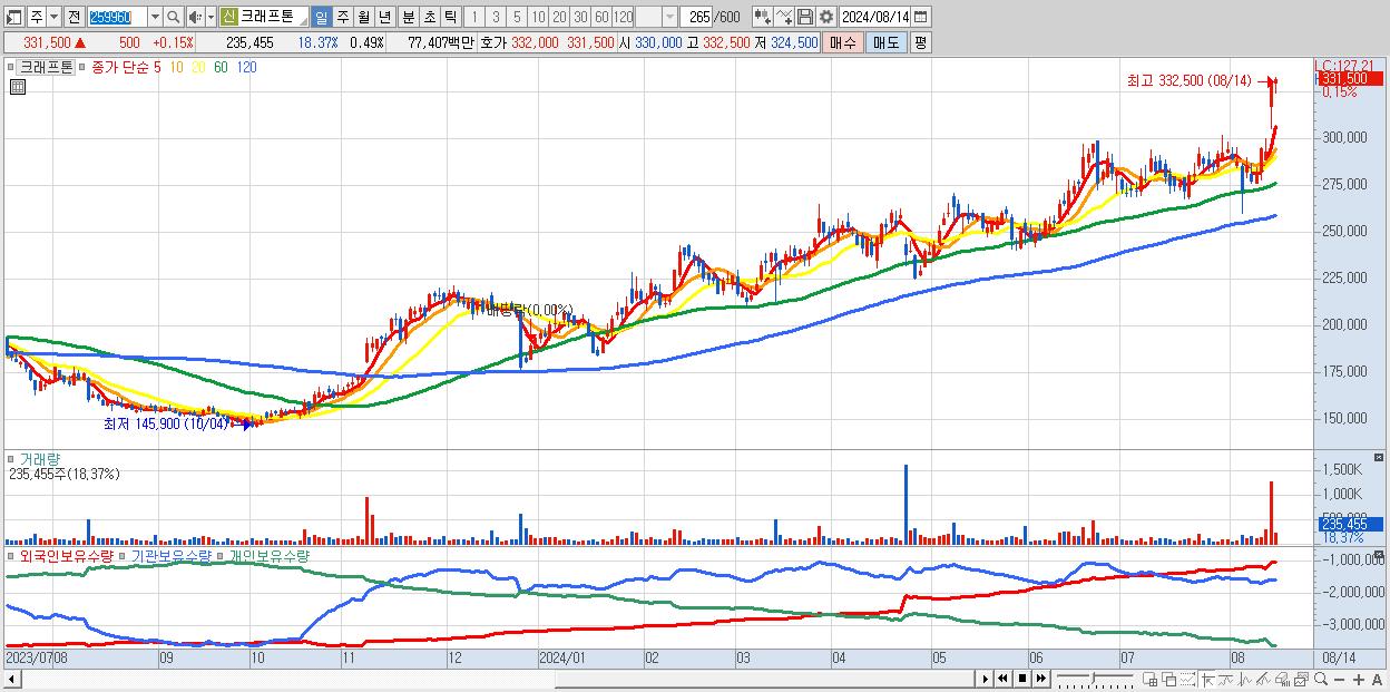 - 크래프톤 (331,500원 ▲ 0.15% , 시총: 158,757억, 외국인 순매수 거래금:57억)