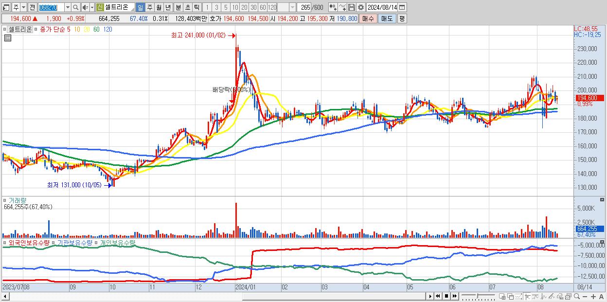 - 셀트리온 (194,600원 ▲ 0.99% , 시총: 422,323억, 외국인 순매수 거래금:40억)