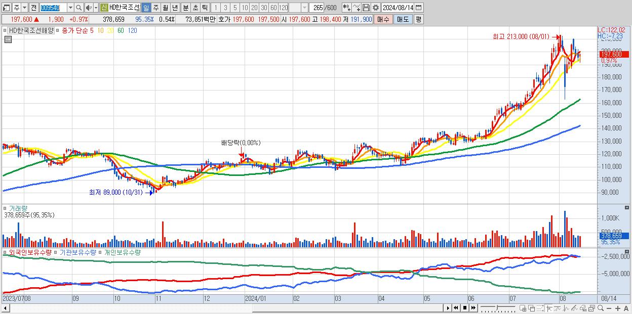 - HD한국조선해양 (197,600원 ▲ 0.97% , 시총: 139,848억, 외국인 순매수 거래금:51억)