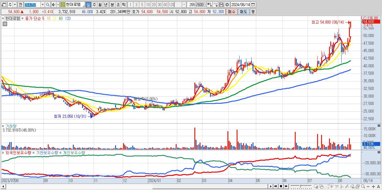 - 현대로템 (54,600원 ▲ 3.41% , 시총: 59,592억, 외국인 순매수 거래금:218억)