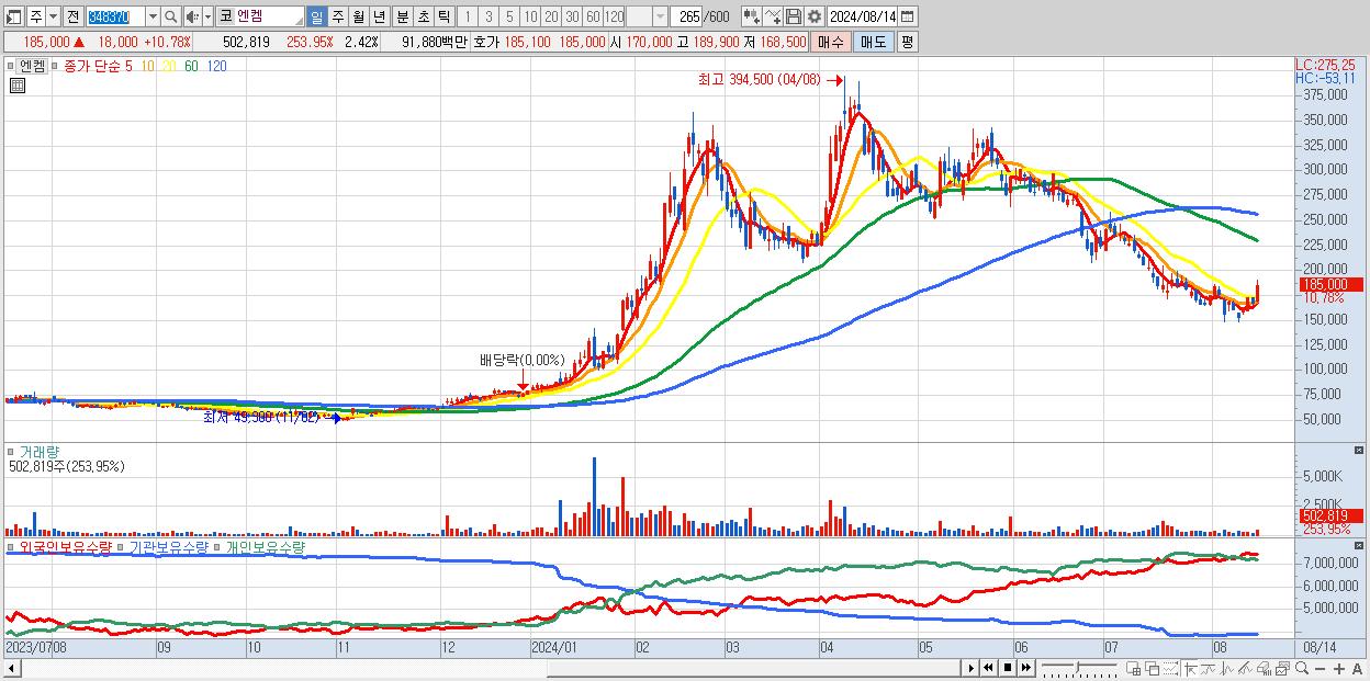 - 엔켐 (185,000원 ▲ 10.78% , 시총: 38,456억, 외국인 순매수 거래금:80억)