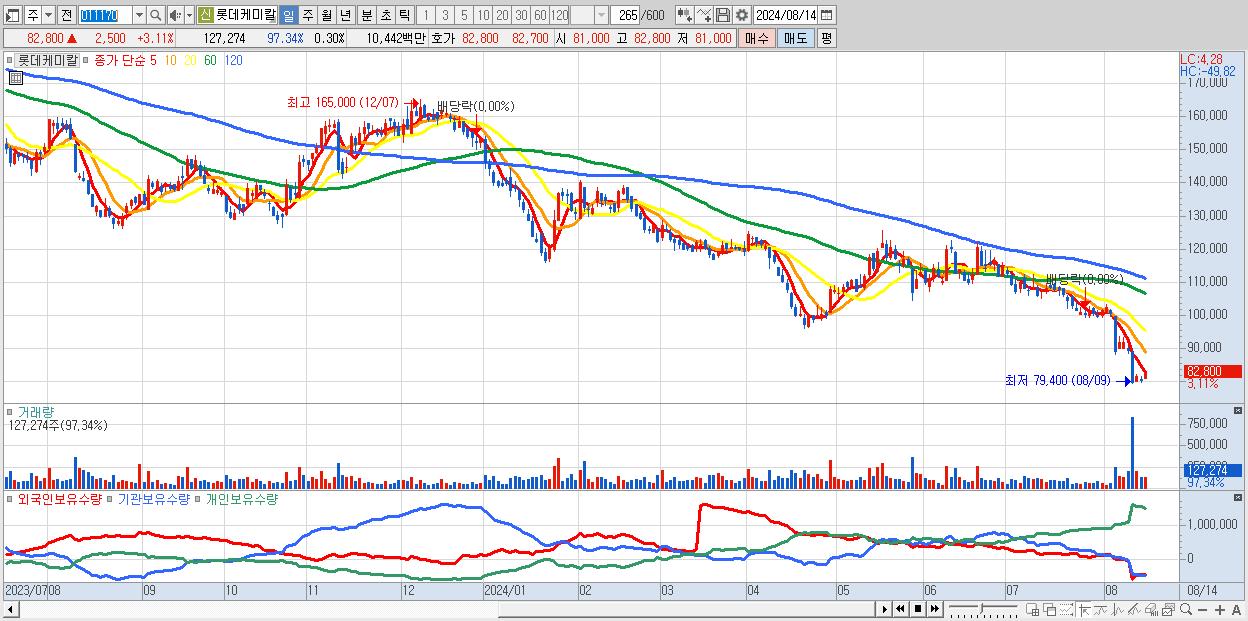 - 롯데케미칼 (82,800원 ▲ 3.11% , 시총: 35,418억, 외국인 순매수 거래금:45억)