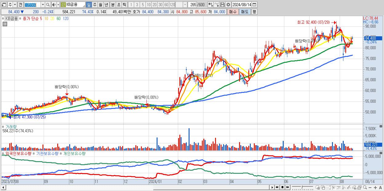 - KB금융 (84,400원 ▼ -0.24% , 시총: 340,563억, 외국인 순매수 거래금:46억)