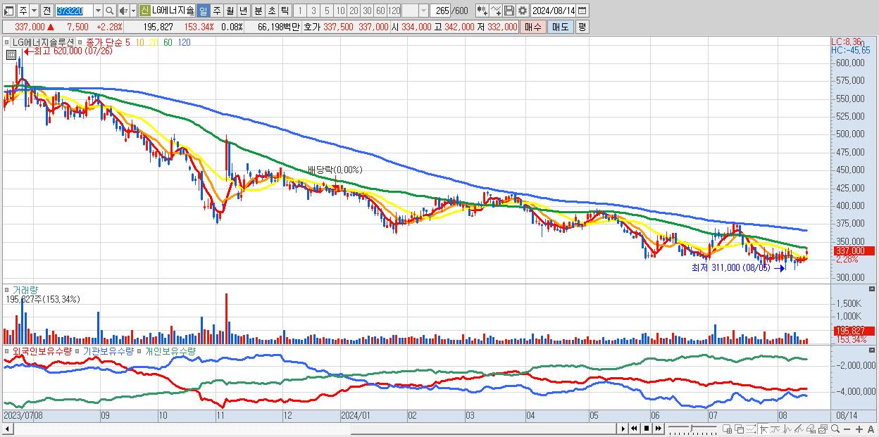 - LG에너지솔루션 (337,000원 ▲ 2.28% , 시총: 788,580억, 외국인 순매수 거래금:192억)