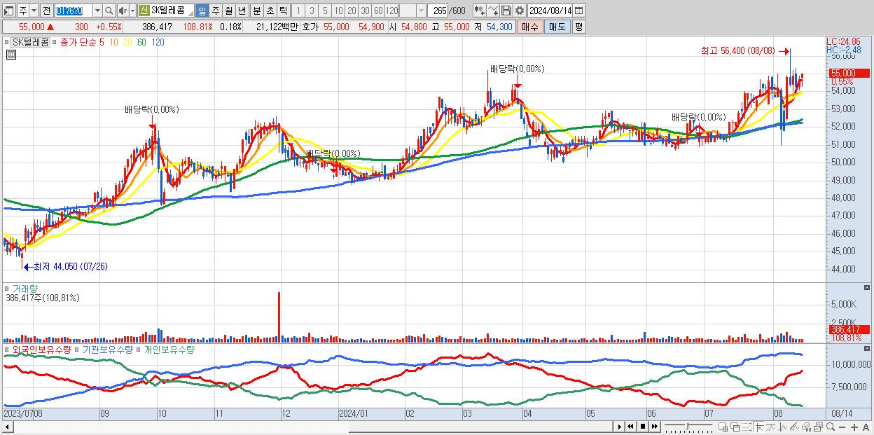 - SK텔레콤 (55,000원 ▲ 0.55% , 시총: 118,135억, 외국인 순매수 거래금:94억)