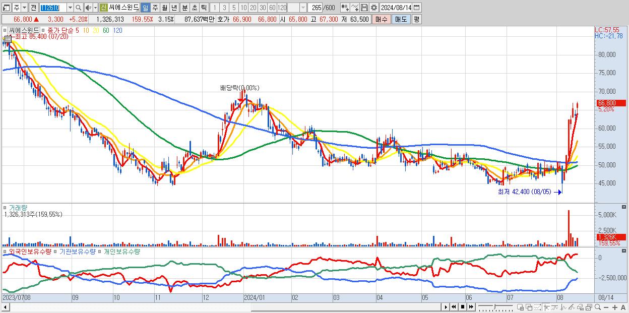 - 씨에스윈드 (66,800원 ▲ 5.2% , 시총: 28,170억, 외국인 순매수 거래금:51억)