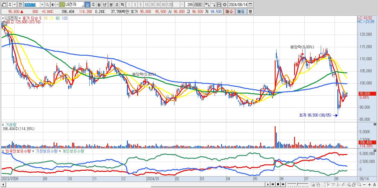 - LG전자 (95,600원 ▲ 0.84% , 시총: 156,447억, 외국인 순매수 거래금:42억)