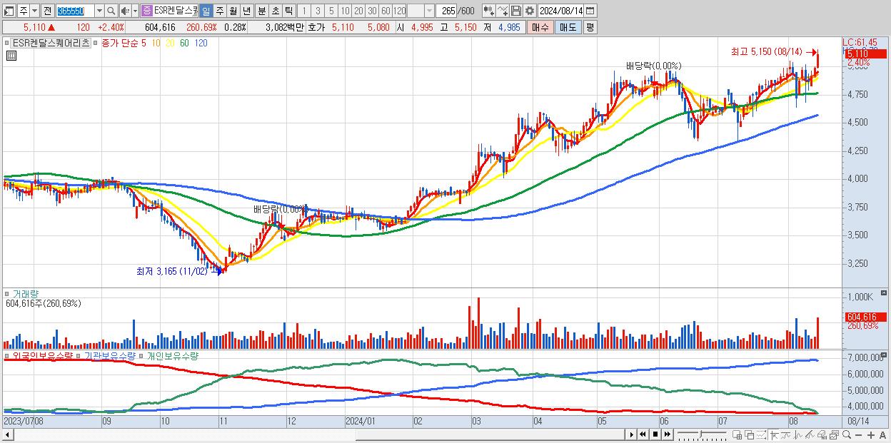 - ESR켄달스퀘어리츠 (5,110원 ▲ 2.4% , 시총: 10,889억, 거래량: 604,616, 거래대금:31억, KOSPI)